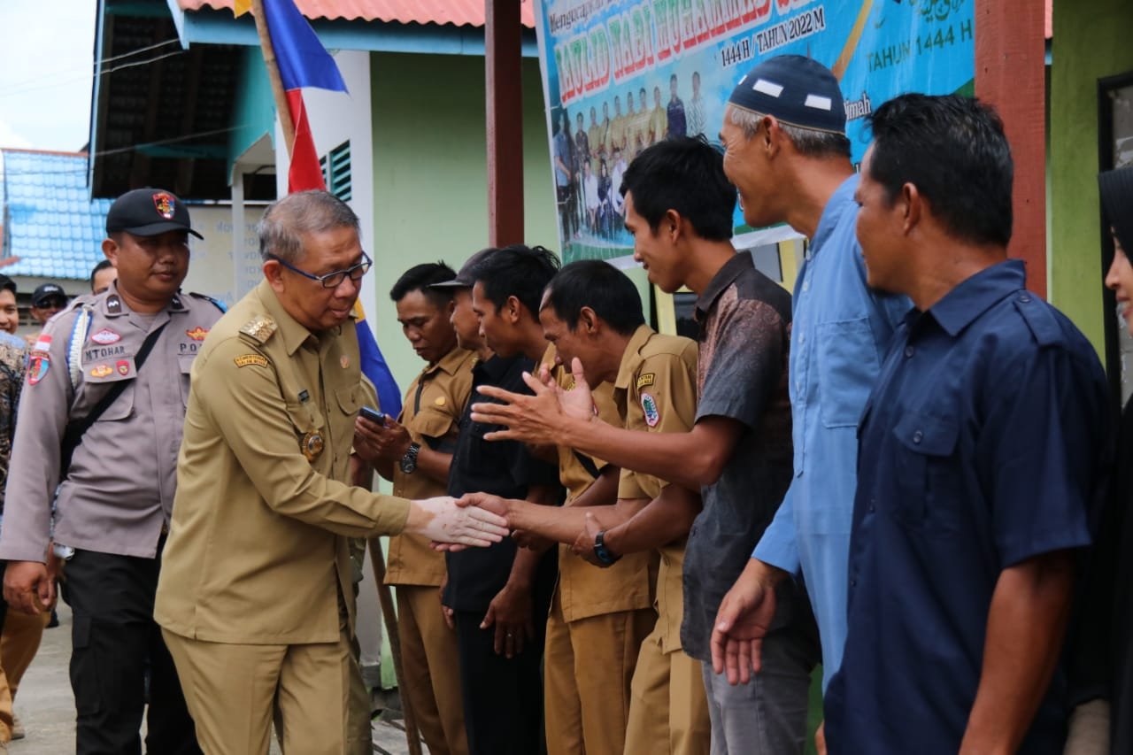 Usai menyerahkan bantuan tersebut, Gubernur menyapa para warga yang berada disekitar kawasan kantor camat dengan diiringi tabuh gendang.