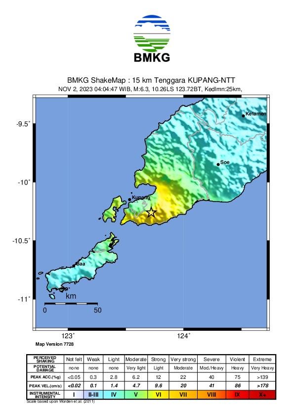 Dilihat dari kekuatan gempa yang diukur dengan skala Modified Mercalli Intesity (MMI), Kupang terpantau VI MMI, Kabupaten TTS IV-V MMI, Rote, Waingapu dan Alor III MMI, sedangkan Lembata dan Larantuka II MMI. BMKG mendeskripsikan VI MMI adanya getaran dirasakan oleh semua penduduk. Kebanyakan semua terkejut dan lari keluar, plester dinding jatuh dan cerobong asap pada pabrik rusak, kerusakan ringan.