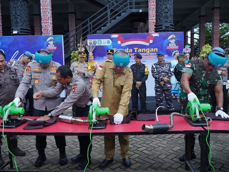Kapolda Kalbar Irjen Pol Pipit Rismanto, S.I.K., M.H., bersama Gubernur Provinsi Kalbar dr. Harisson, M.Kes., dan Pangdam XII/Tanjungpura Mayjen TNI Iwan Setiawan, S.E., M.M., memimpin Apel Deklarasi Kalbar Zero Knalpot Brong yang bertempat di Rumah Radakng, Sabtu (27/1).