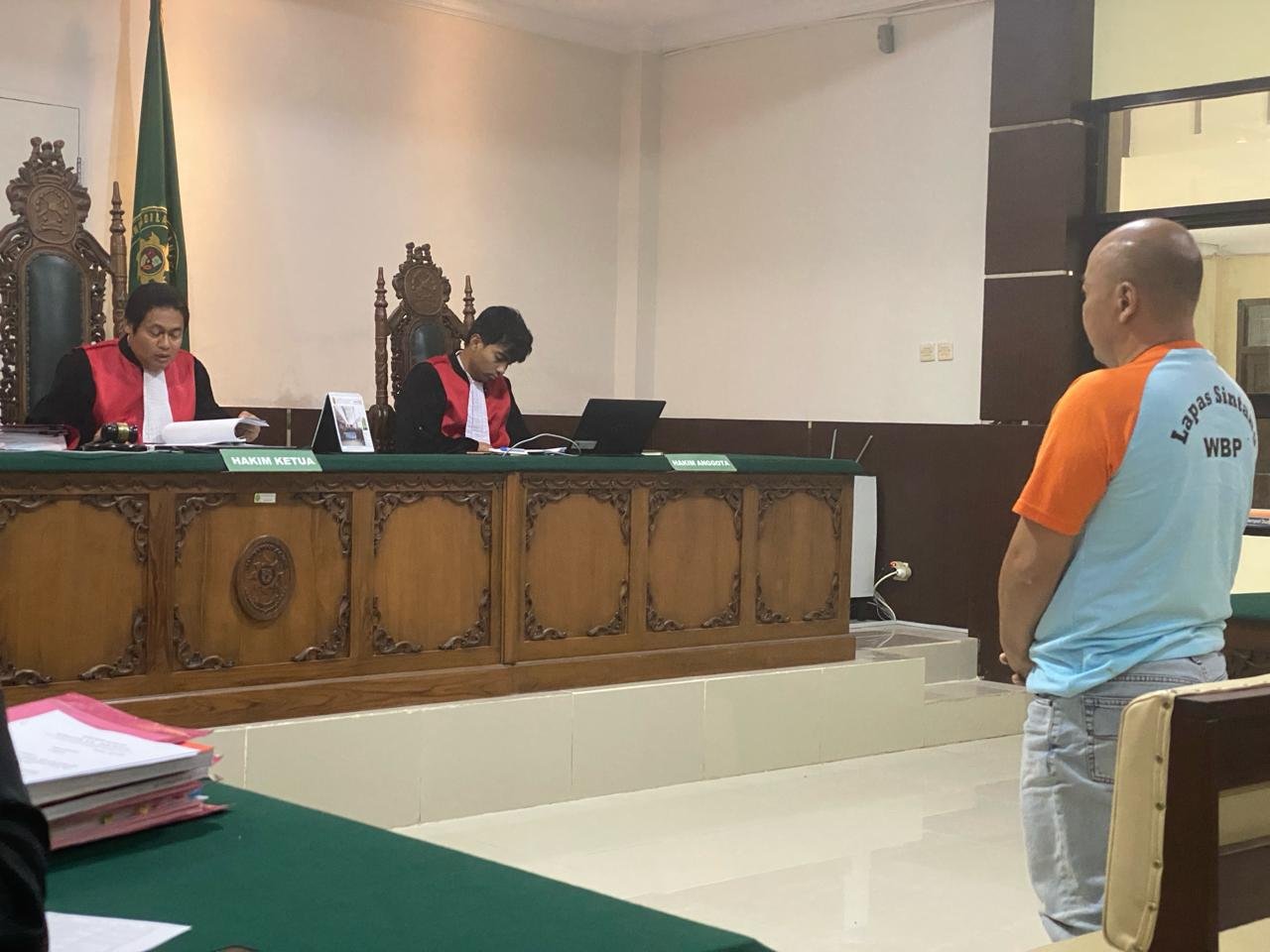 SINTANG- Majelis hakim Pengadilan Negeri Sintang menjatuhkan pidana penjara kepada Budiyanto selama 1 tahun 8 bulan dan selama 10 bulan kepada terdakwa Adrianus Nyabang atas perkara perdagangan 337,8 Kg sisik Trenggiling pada sidang putusan yang digelar di Pengadilan Negeri Sintang, Senin (1/4), siang.