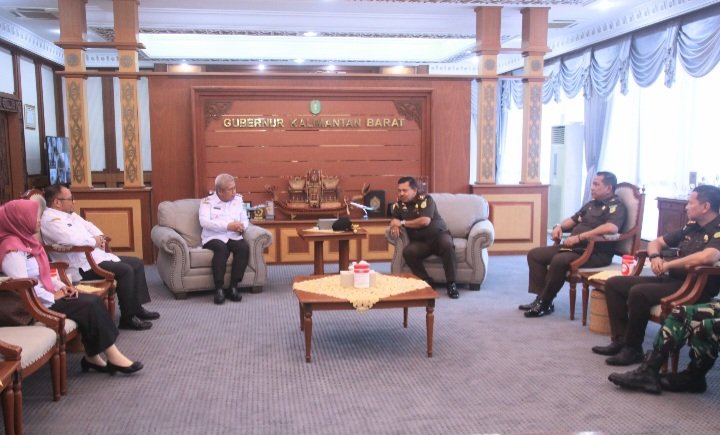 PONTIANAK – Gubernur Kalimantan Barat, dr. Harisson, M.Kes. didampingi Sekretaris Daerah, Mohammad Bari, S.Sos. M.Si. dan Inspektur Provinsi, Dra. Marlyna, M.Si., CRA., CRP., CGCAE. menerima kunjungan Kepala Kejaksaan Tinggi (Kajati) Kalimantan Barat yang baru, Edyward Kaban, S.H., M.H. dan jajaran di Ruang Kerja Gubernur, Rabu (26/6).