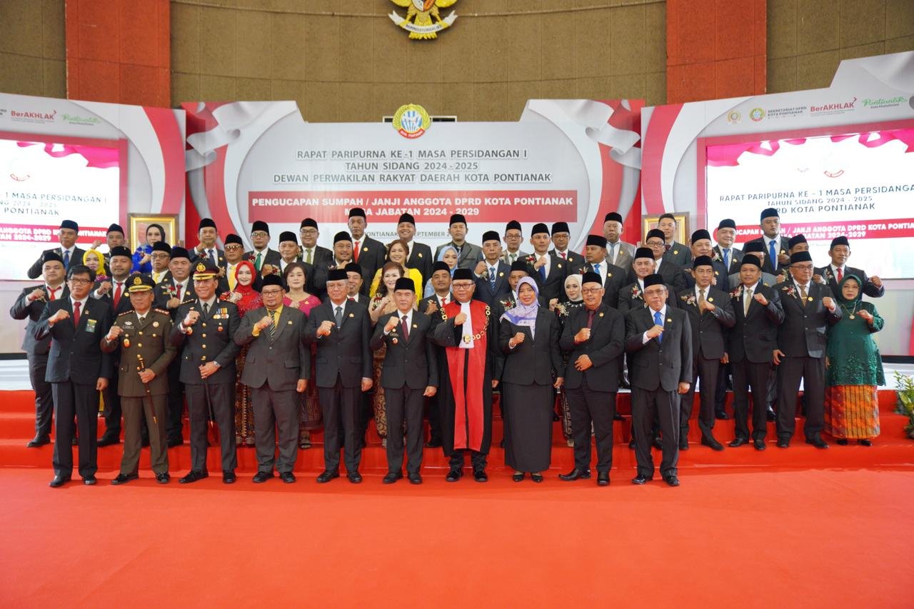 PONTIANAK – Pelantikan dan pengambilan sumpah janji sebanyak 45 Anggota Dewan Perwakilan Rakyat Daerah (DPRD) Kota Pontianak hasil Pemilihan Umum (Pemilu) 2024 berjalan lancar. Ketua Pengadilan Negeri Kota Pontianak Akhmad Fijiarsyah Joko Sutrisno bertugas selaku pengukuh sumpah. Satarudin ditunjuk sebagai ketua sementara DPRD Kota Pontianak periode 2024-2029 atas perolehan suara terbanyak.