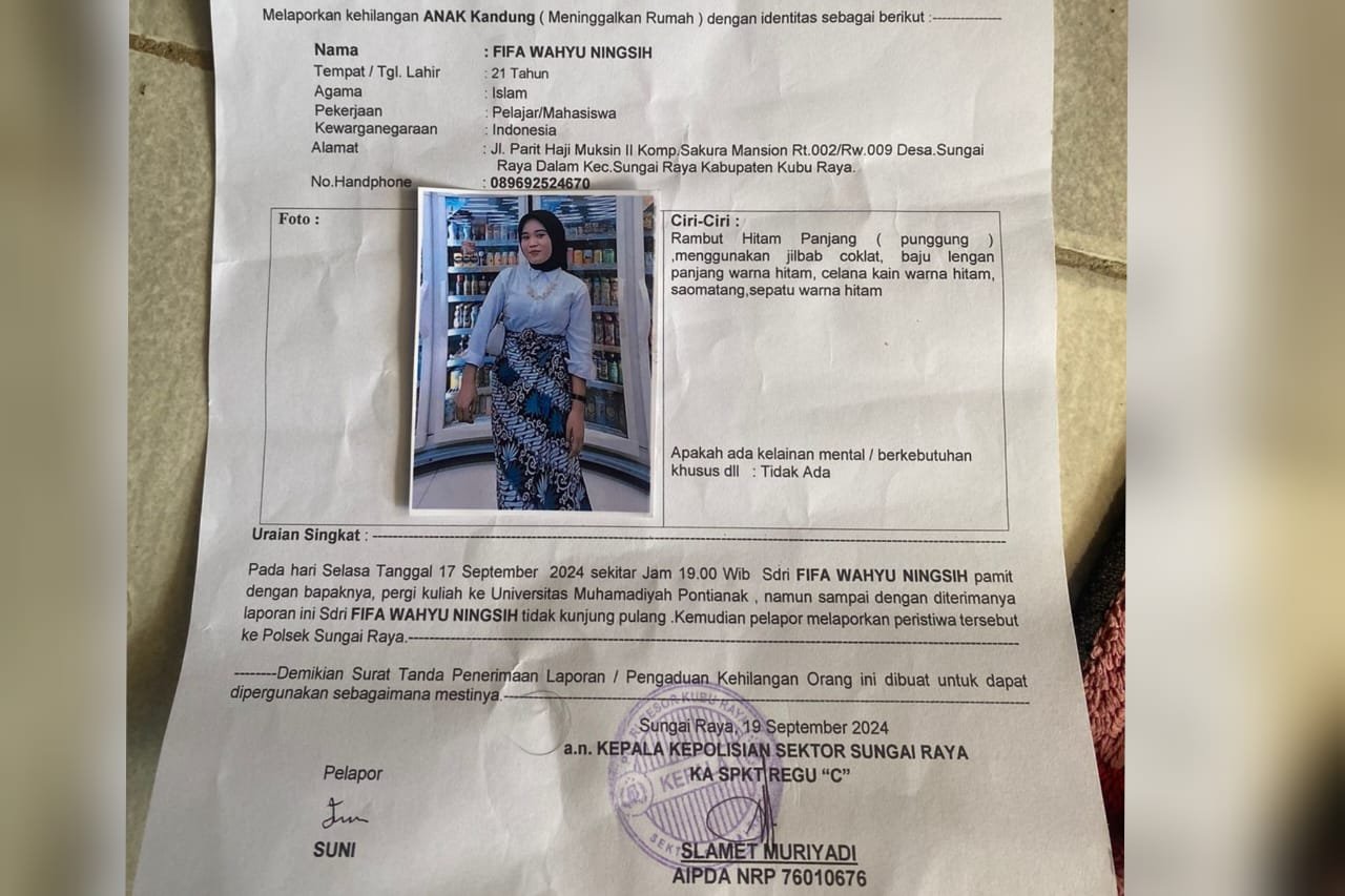 - KUBU RAYA – Seorang perempuan bernama Fifa Wahyu Ningsih (21) dilaporkan hilang oleh keluarganya setelah tidak kembali ke rumah sejak Selasa (17/9/2024).