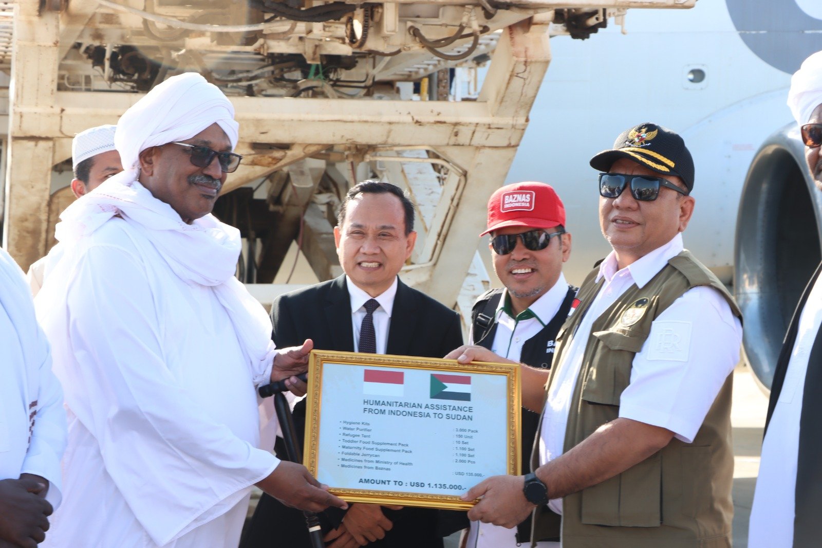 Setibanya di Sudan, rombongan delegasi Indonesia disambut oleh Anas Altayeb Aljilani Plh. Wakil Menteri Luar Negri Sudan, Ismat Mustafa Yousif Deputi Menteri Kesehatan Federal Sudan beserta jajaran. Bantuan kemanusiaan berupa obat-obatan, alat kesehatan, logistik dan beberapa barang sesuai permintaan Pemerintah Republik Sudan senilai kurang lebih USD 1 Juta tersebut kemudian diturunkan dari lambung pesawat sesaat setelah mendarat.