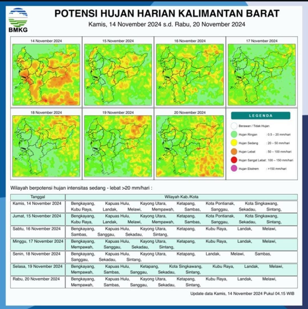 PONTIANAK – Badan Meteorologi, Klimatologi, dan Geofisika (BMKG) Kalimantan Barat memperkirakan wilayah Kalimantan Barat akan mengalami potensi hujan di seluruh daerahnya, Kamis (14/11/2024).