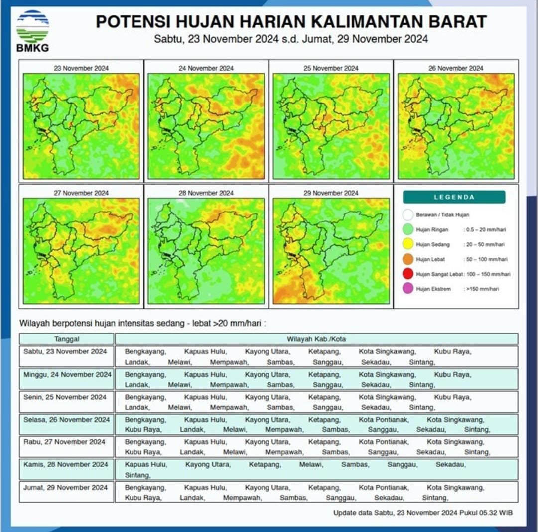 “Per hari ini, Sabtu (23/11/2024), setidaknya terdeteksi ada dua wilayah yang masuk kategori waspada dalam menghadapi dampak hujan lebat, yakni Sintang dan Kapuas Hulu,” ujarnya.