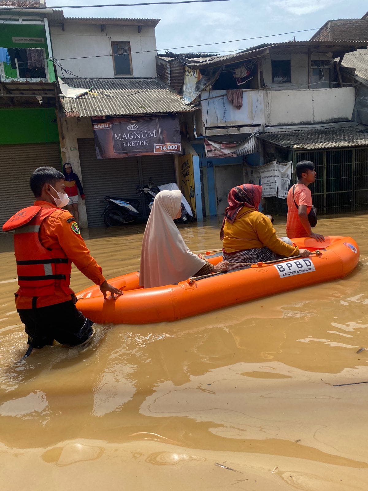 Berdasarkan informasi dari Badan SAR Kabupaten Bandung, tim pencarian dan pertolongan masih melakukan pencarian satu warga yang diduga hilang terseret arus.