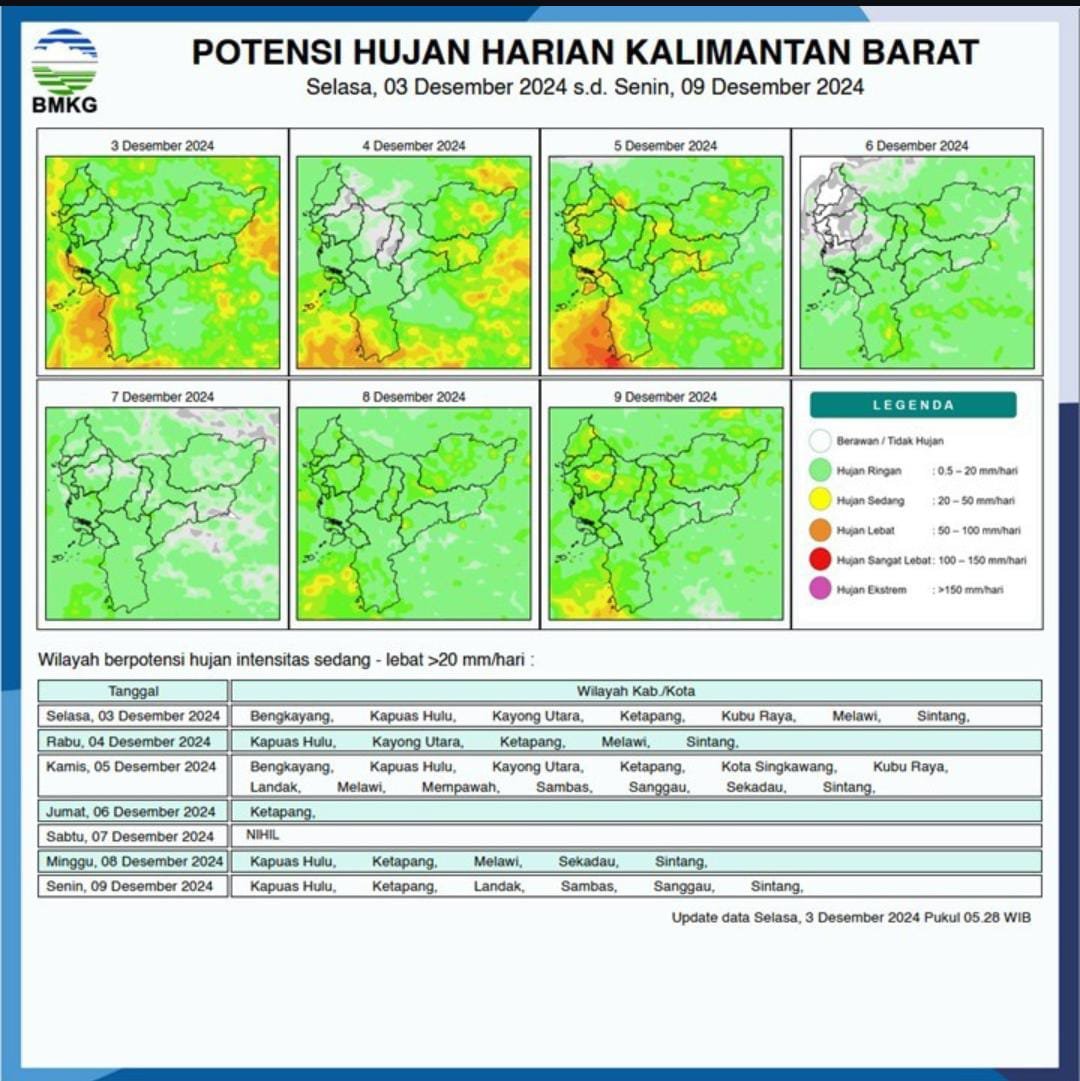 “Untuk Selasa (3/12/2024) ini, Kalimantan Barat akan berpotensi menghadapi hujan dengan sejumlah wilayah, seperti Kubu Raya, Bengkayang, Kapuas Hulu, Kayong Utara, Ketapang, Melawi, dan Sintang berkemungkinan menghadapi hujan intensitas sedang hingga lebat,” ucapnya.