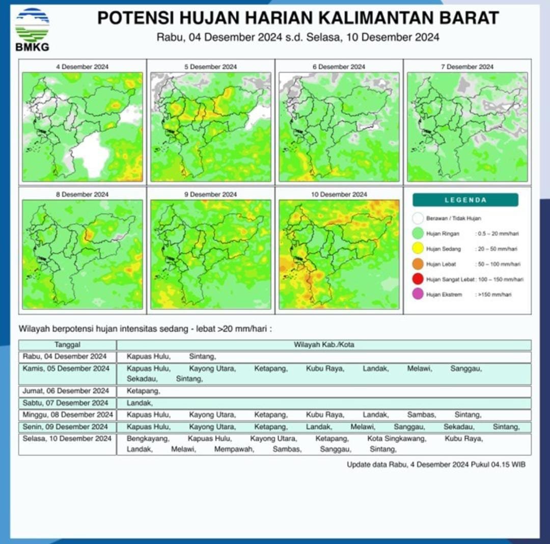 “Berdasarkan pantauan kami untuk Rabu (4/12/2024), sebagian wilayah Kalimantan Barat akan berpotensi menghadapi hujan ringan dan lainnya berawan saja,” ujarnya.