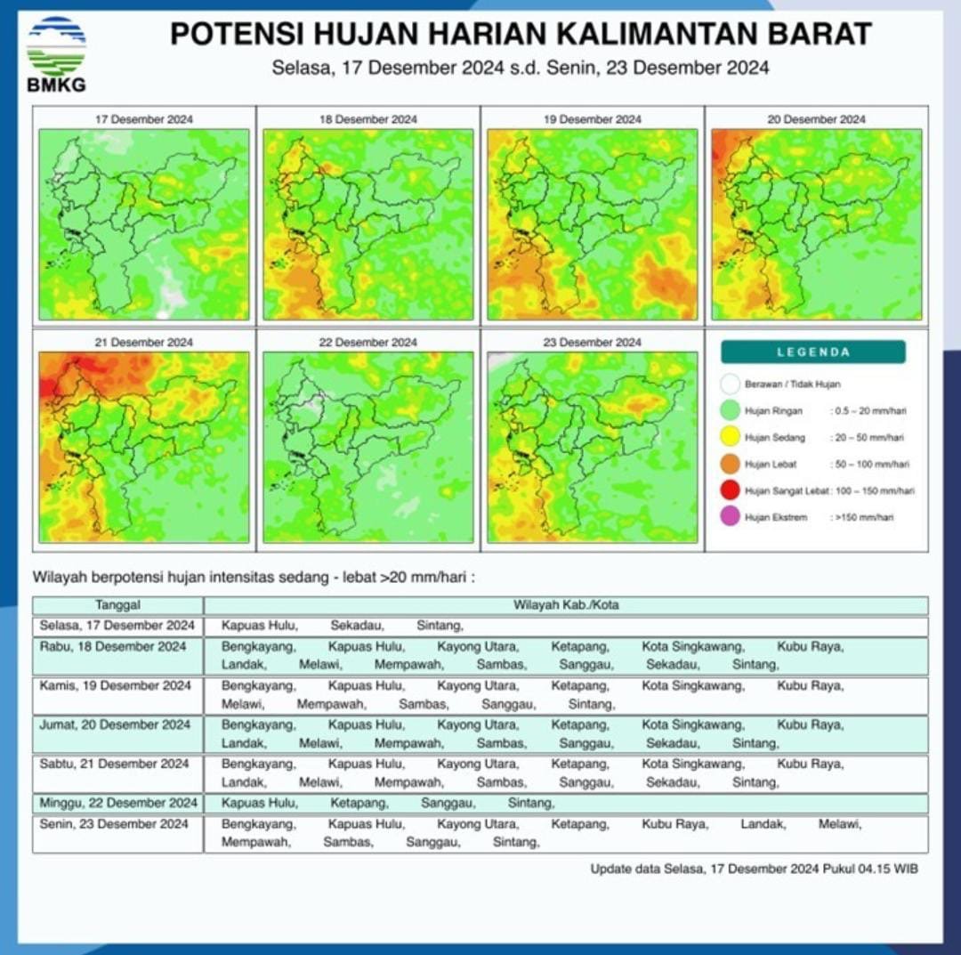 “Pada Selasa (17/12/2024), sebagian besar wilayah Kalimantan Barat akan menghadapi potensi hujan. Kapuas Hulu, Sekadau, dan Sintang berpotensi menghadapi hujan intensitas sedang hingga lebat,” tuturnya, Selasa (17/12/2024).
