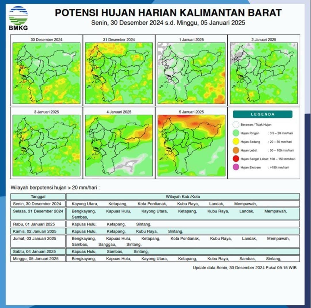 “Pada Senin (30/12/2024), wilayah Kalimantan Barat diperkirakan akan mengalami hujan dengan sejumlah daerah seperti Kayong Utara, Ketapang, Pontianak, Kubu Raya, Landak, dan Mempawah akan berpotensi mengalami hujan intensitas sedang hingga lebat,” ujarnya.