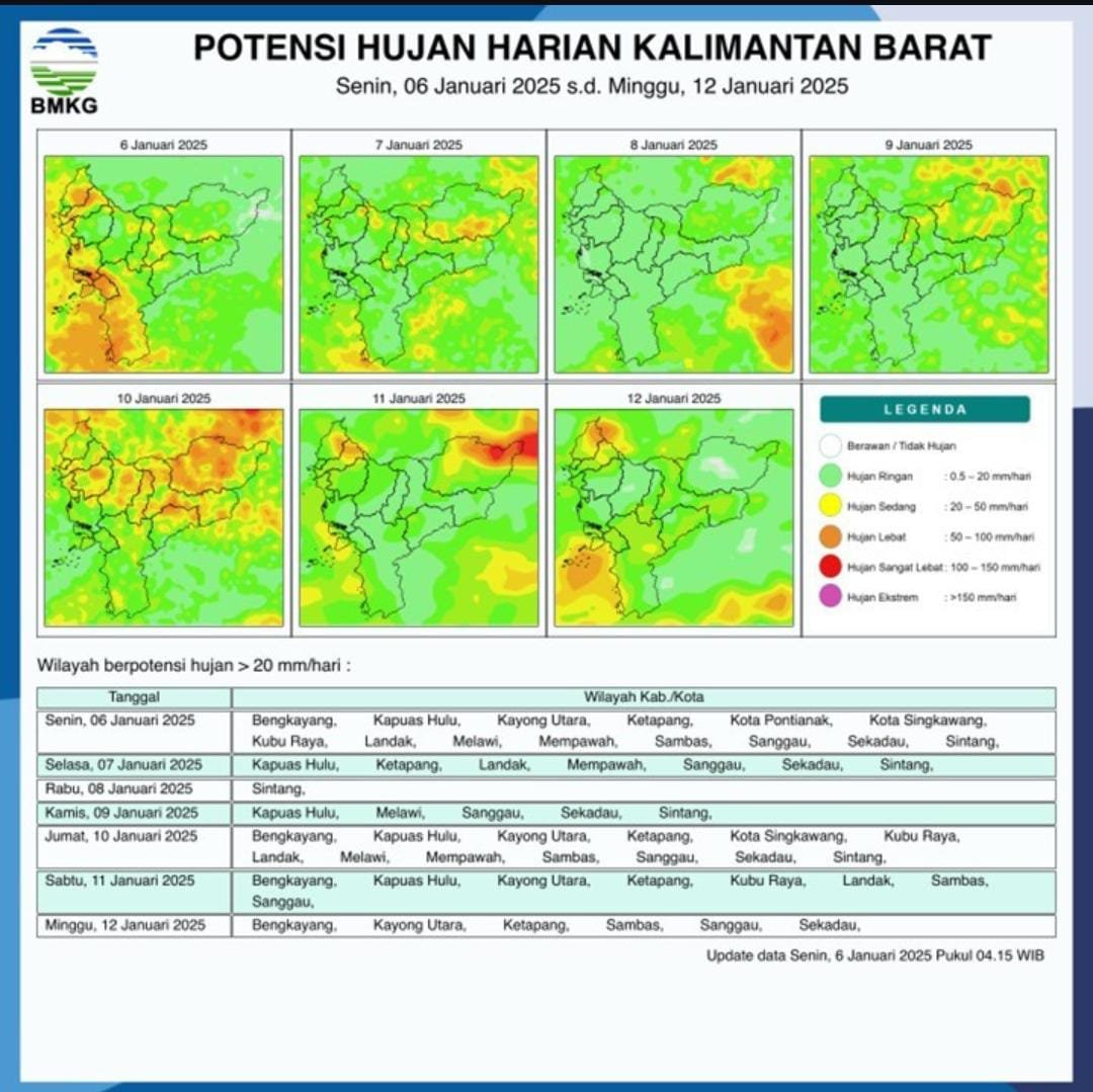 “Berdasarkan pantauan yang dilakukan, diperkirakan pada Senin (6/1/2025) bahwa seluruh wilayah Kalimantan Barat berpotensi mengalami hujan intensitas sedang hingga lebat,” tuturnya.
