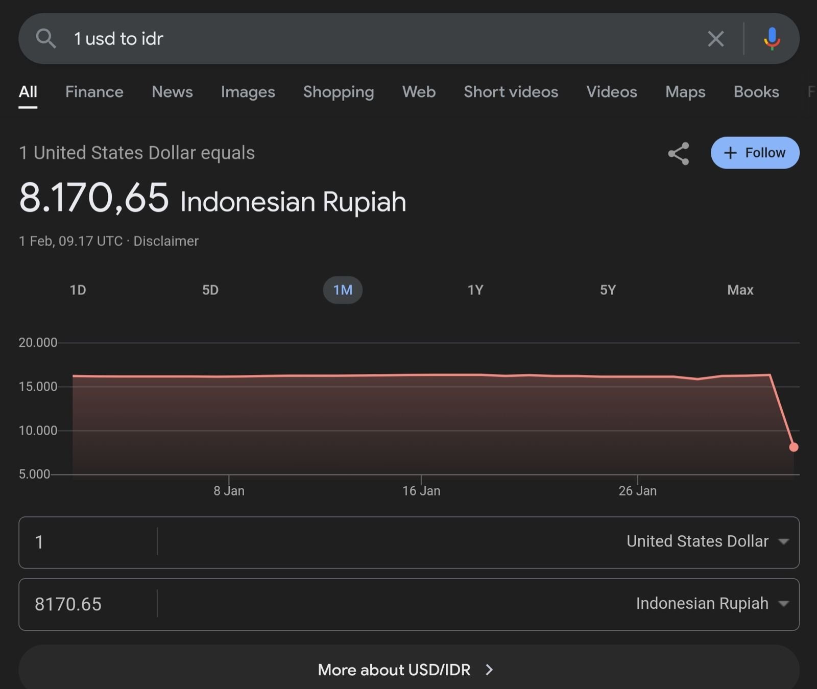 “Level nilai tukar USD/IDR Rp8.100-an sebagaimana yang muncul di Google bukanlah angka yang sebenarnya. Data resmi Bank Indonesia mencatat kurs jual Rp16.340,30 dan kurs beli Rp16.177,70 per 1 dolar AS pada tanggal 31 Januari 2025,” kata Denny pada Sabtu (1/2/2025).