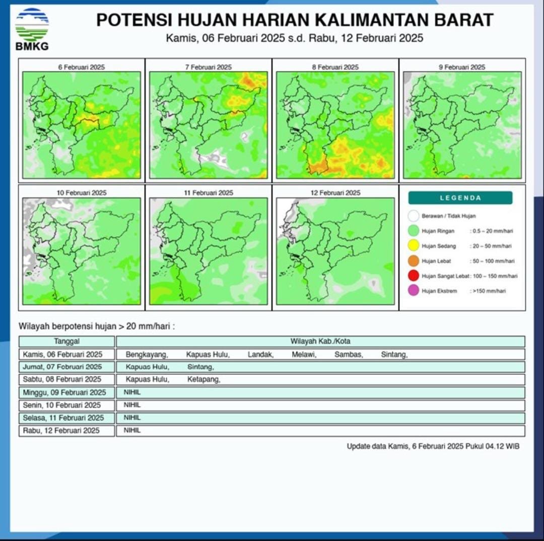 PONTIANAK – Badan Meteorologi, Klimatologi, dan Geofisika (BMKG) Kalimantan Barat memperkirakan bahwa wilayah Kalimantan Barat akan berpotensi mengalami hujan pada sebagian besar wilayahnya.
