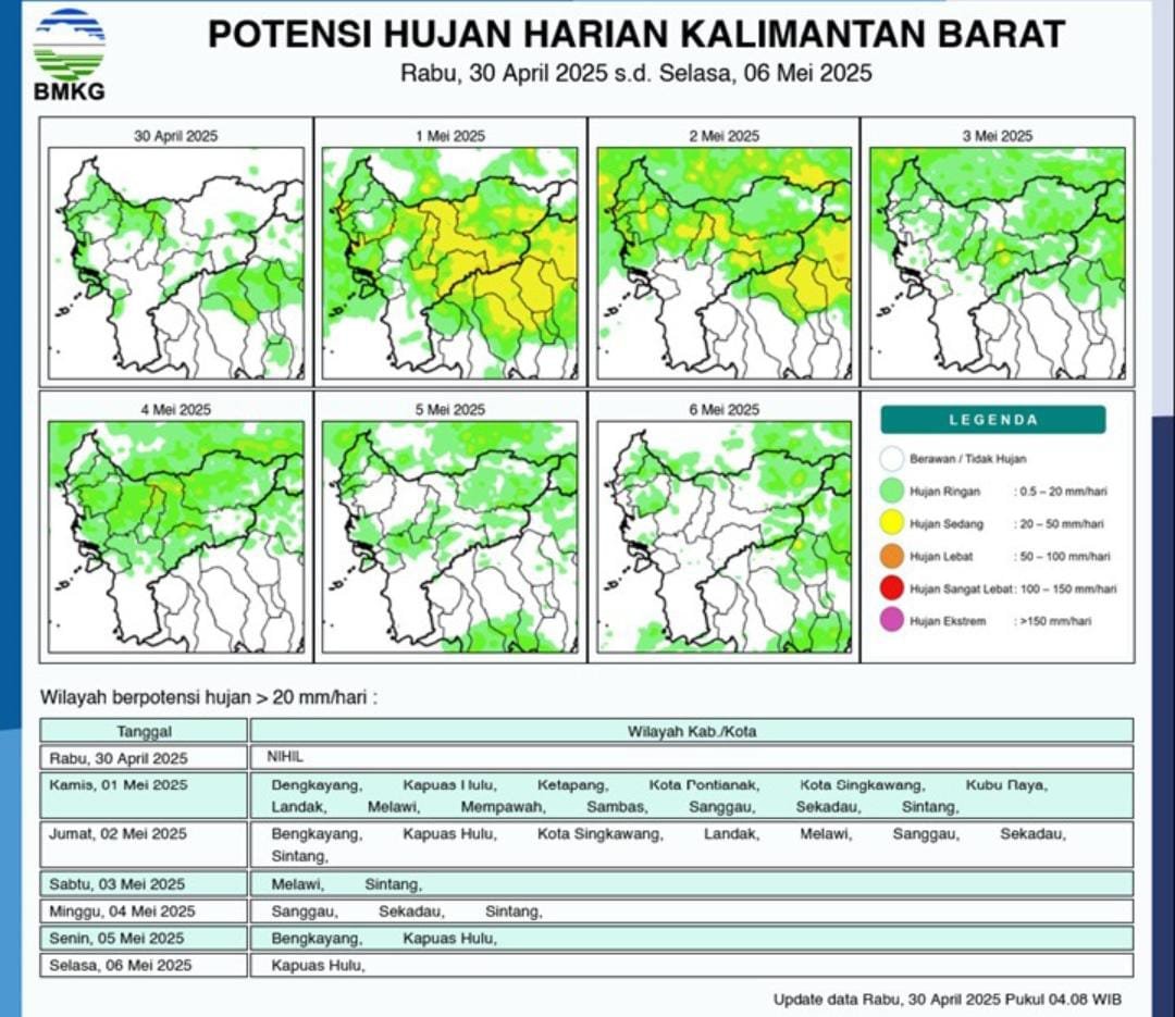 FaktaKalbar.id, PONTIANAK- Badan Meteorologi, Klimatologi, dan Geofisika (BMKG) Kalimantan Barat memperkirakan bahwa hanya beberapa wilayah Kalimantan Barat akan berpotensi hujan pada Rabu (30/4).