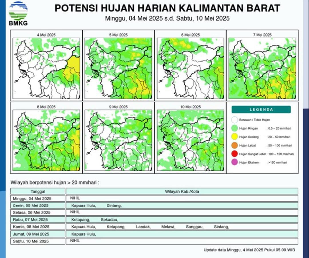 FaktaKalbar.id, PONTIANAK- Badan Meteorologi, Klimatologi, dan Geofisika (BMKG) Kalimantan Barat memperkirakan bahwa hanya ada beberapa titik wilayah Kalimantan Barat akan berpotensi hujan pada Minggu (4/5).