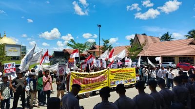PONTIANAK – Sejumlah massa yang tergabung dalam Front Perjuangan Rakyat Ketapang (FPRK) berunjuk rasa di Mapolda Kalimantan Barat, Kamis (3/20/2024). Unjuk rasa ini ingin meminta Kapolda Kalbar, Irjen Pol Pipit…